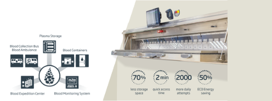 System automatycznej mroźni osocza pracuje w ekstremalnie niskiej temperaturze, poniżej -32°C, zapewniając idealne warunki do przechowywania osocza. Wszystkie operacje magazynowe wykonywane są poza mroźnią, z wykorzystaniem ekranu dotykowego oraz skanera kodów kreskowych. System Zarządzania Magazynem (WMS Hydra) przeznaczony jest do zarządzania zapasami osocza i działa w standardzie ISBT 128. System może być zintegrowany z lokalnym systemem Bank Krwi. Pojemność systemu serii MK10-50 P, zależnie od potrzeb, waha się od 5 do 25 tys. jednostek osocza [250 ml].